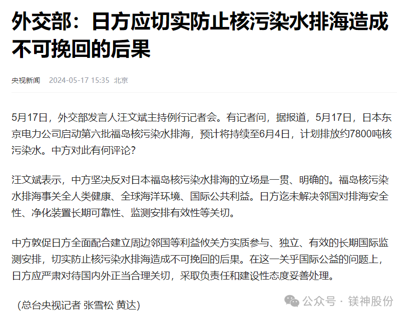 多家日本企業(yè)(如:日本神島化學(xué)有限公司、日本協(xié)和化學(xué)工業(yè)有限公司、日本富田制藥株式會社、日本宇部株式會社、日本達(dá)泰豪化工工業(yè)株式會社等)正在使用被核污水污染的海水生產(chǎn)鎂鹽產(chǎn)品(如:碳酸鎂、硫酸鎂、氫氧化鎂、氧化鎂等)的事實(shí)引起了人們的關(guān)注。