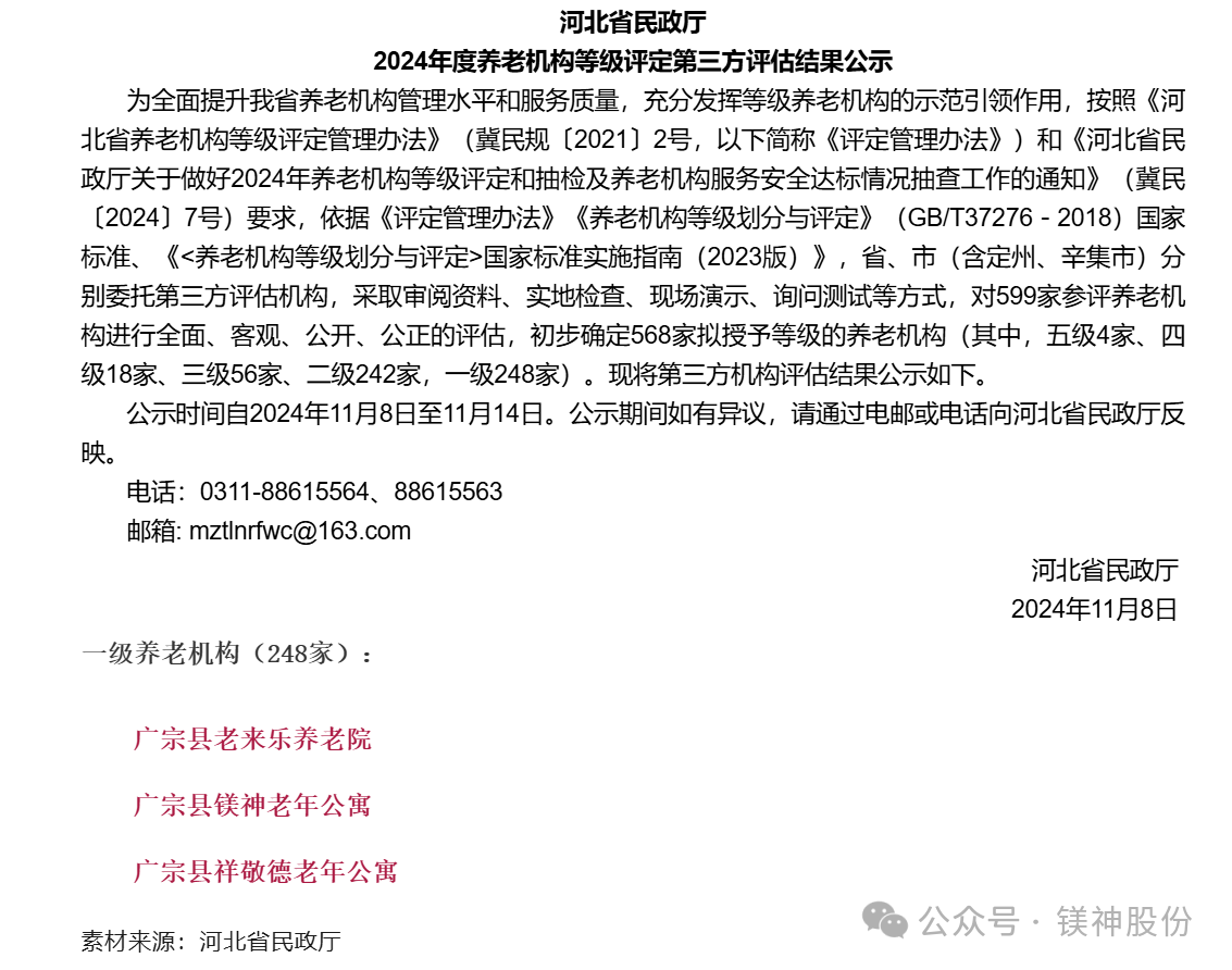 近日,河北鎂神科技股份有限公司旗下的廣宗縣鎂神老年公寓通過養(yǎng)老機構(gòu)等級評定,獲河北省一級養(yǎng)老機構(gòu)。